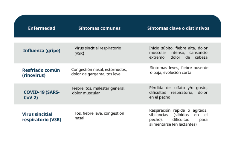 Aunque muchas de las enfermedades respiratorias comparten síntomas similares, existen características que pueden orientar sobre el tipo de infección. A continuación, se describen los síntomas más frecuentes y algunos signos distintivos de las principales enfermedades virales respiratorias: