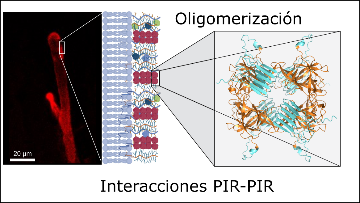 Figura 3. Las proteínas PIR se acumulan como parchecitos sobre la pared celular. Experimentos de inmunofluorescencia con anticuerpos que identifican específicamente la fusión de la proteína PIR-1 de Neurospora crassa con el epítopo V5, demostraron que las proteínas PIR no cubren homogéneamente la pared celular, sino que se acumulan como parchecitos (izquierda). Hipotetizamos que esos parchecitos son estabilizadores locales de islotes de β-1,3-glucanos, los polisacáridos a los que se unen las proteínas PIR. Además, debido a las regiones intrínsecamente desordenadas de las proteínas PIR, es posible que esos parchecitos estén formados por oligómeros de las proteínas PIR (derecha).