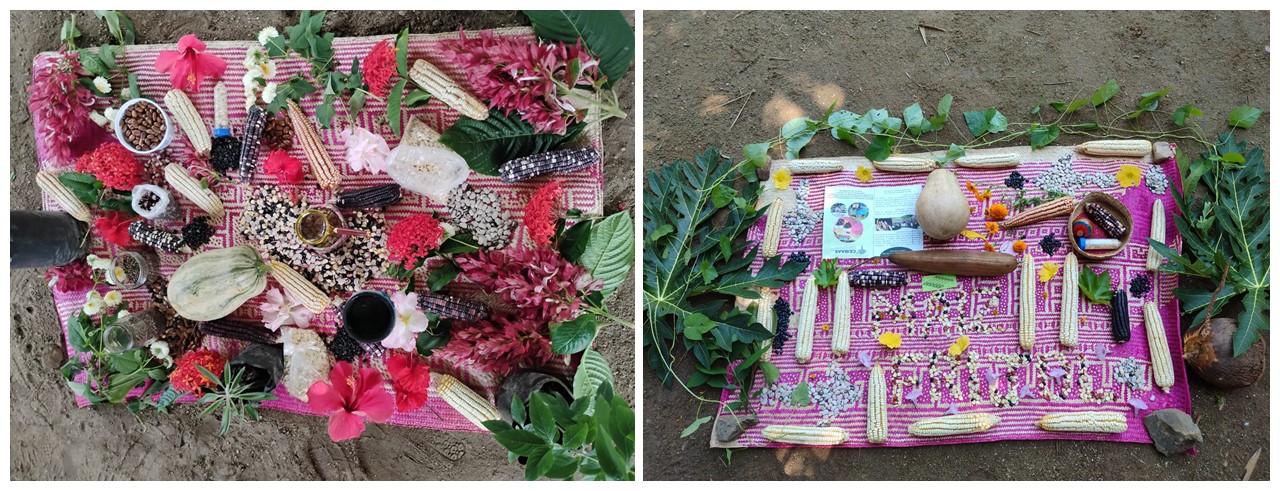Algunas variedades de maíces y frijoles que forman parte del huentle (ofrenda) al iniciar los talleres de diagnóstico participativo