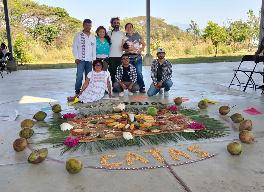 Llegó el día para encontrarnos todas las personas que participamos en el proyecto. Como parte de la apertura del encuentro, se realizó una ceremonia de bienvenida que tuvo al centro el Huentle (ofrenda) que se construyó previamente con las semillas y alimentos agrícolas que llevaron las y los integrantes de las CATA.