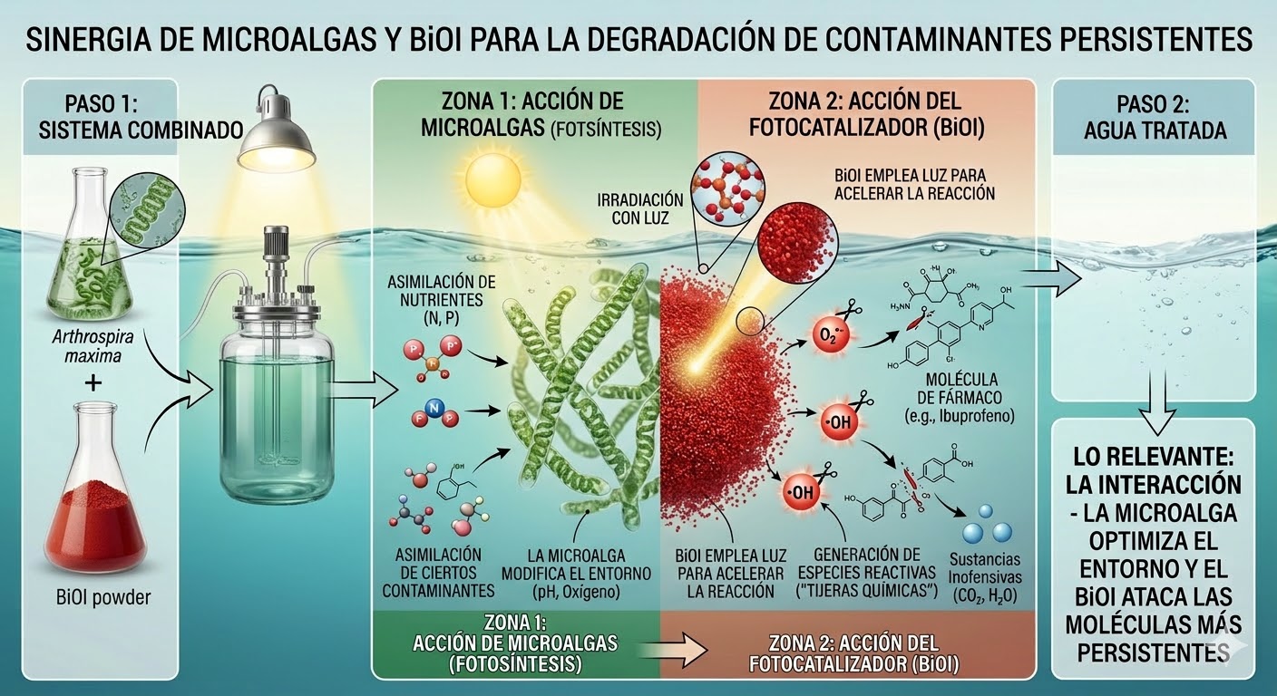 Lo relevante no es cada componente por separado, sino su interacción: la microalga modifica el entorno, mientras que el material fotocatalítico ataca las moléculas más persistentes.